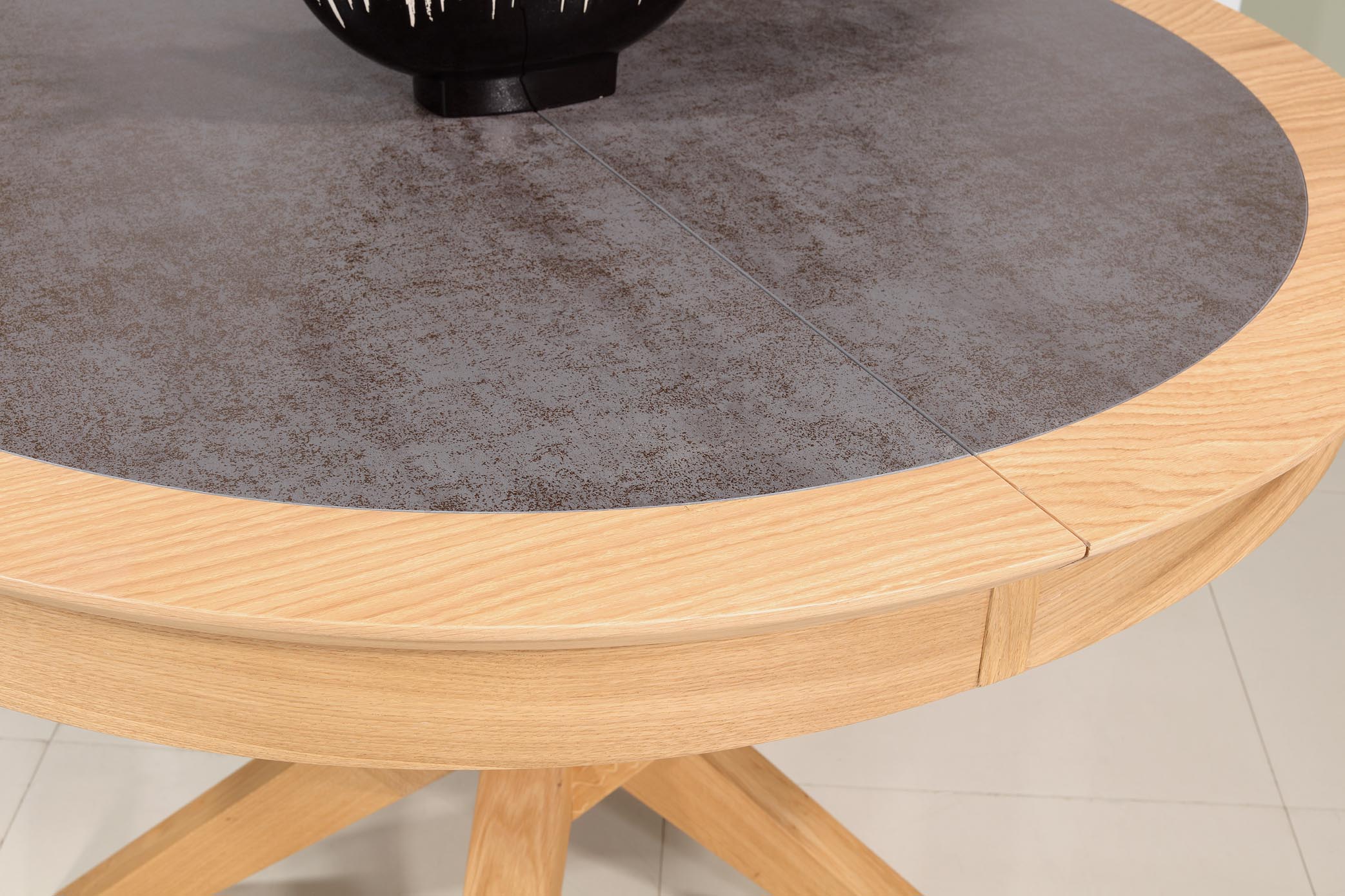 La finition de celle photographie est un chêne brossé naturel, une céramique Iron Grey est encastrée dans le plateau et l'allonge.